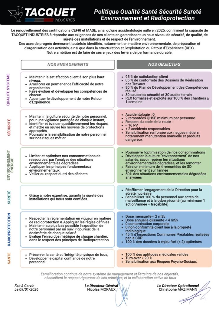 Choisir TACQUET INDUSTRIES, c’est s’assurer d’un partenaire certifié, formé et engagé pour la qualité sécurité environnement. Nos processus sont pensés pour minimiser les risques, réduire les arrêts de production et garantir la conformité réglementaire.