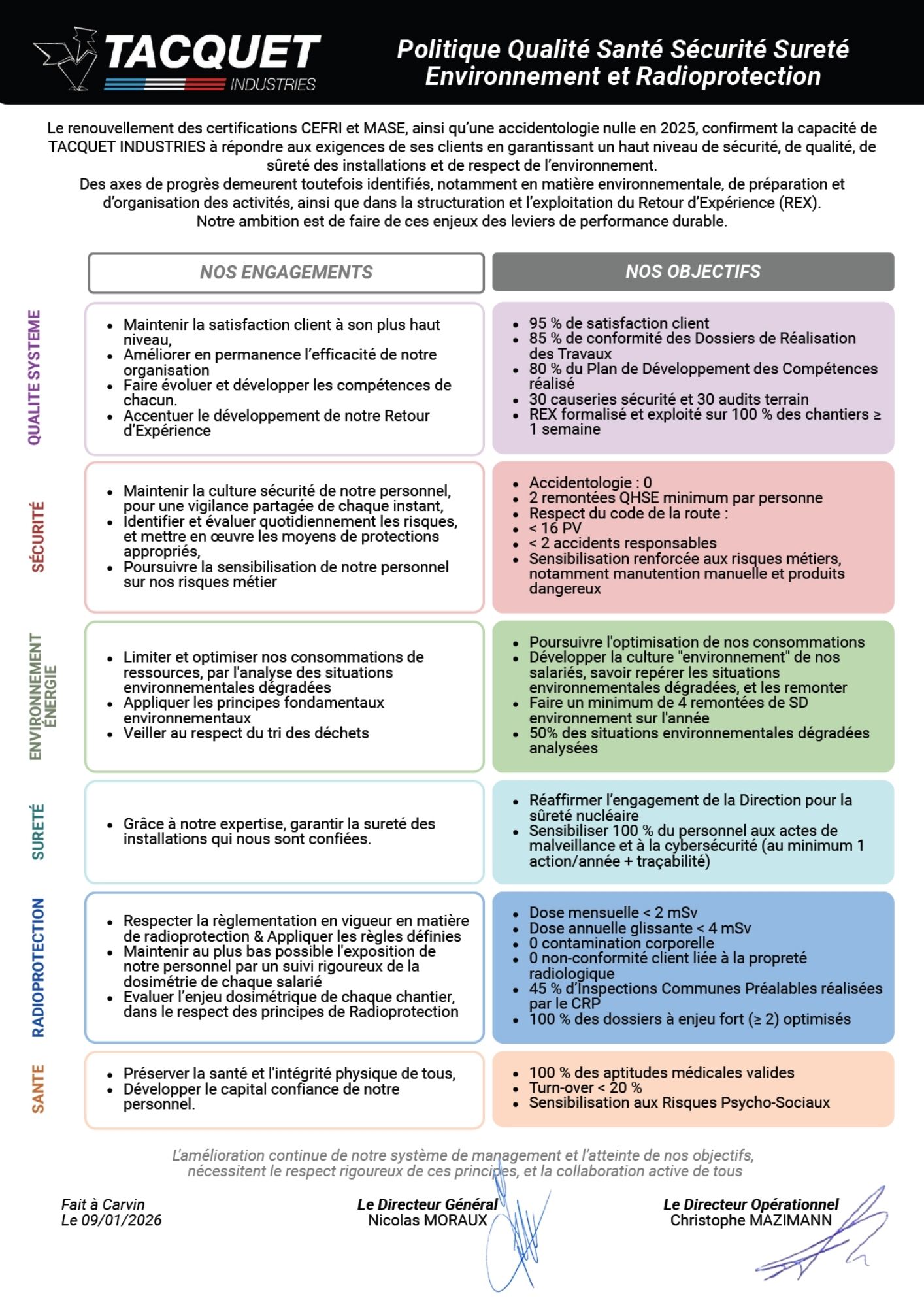 TACQUET INDUSTRIES est engagé dans une démarche sécurité et possède la certification MASE depuis juin 2011. Cette certification atteste que TACQUET INDUSTRIES possède la capacité qualité et organisationnelle pour intervenir en sécurité.